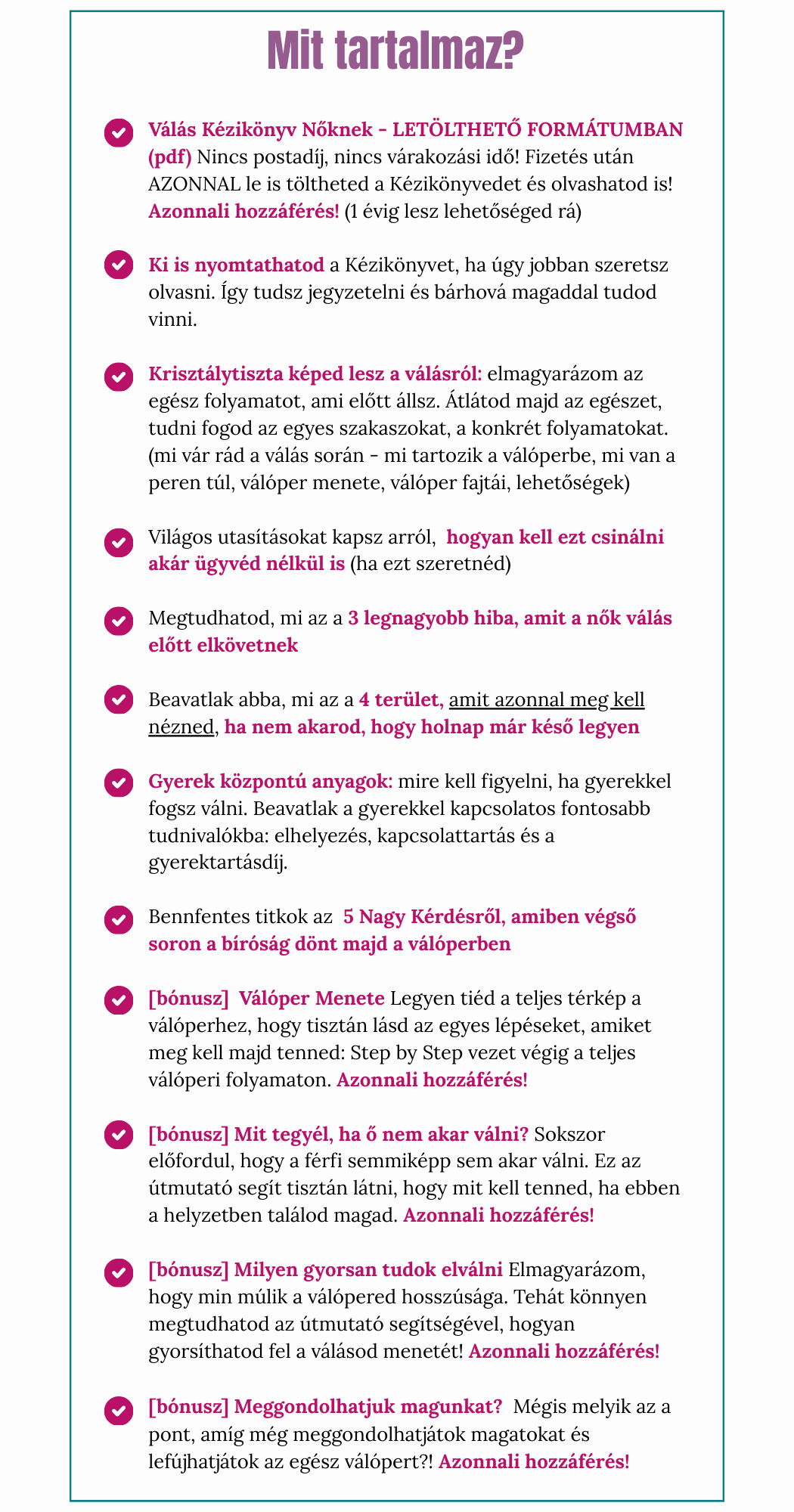 Hiánypótló kézikönyv Nőknek a válásról, amiben MINDENT megosztok veled, amire szükséged van ahhoz, hogy PONTOSAN tudd mi vár rád majd a váláskor és legyen egy kész terved az induláshoz (függetlenül attól, ügyvéddel akarsz-e válni)